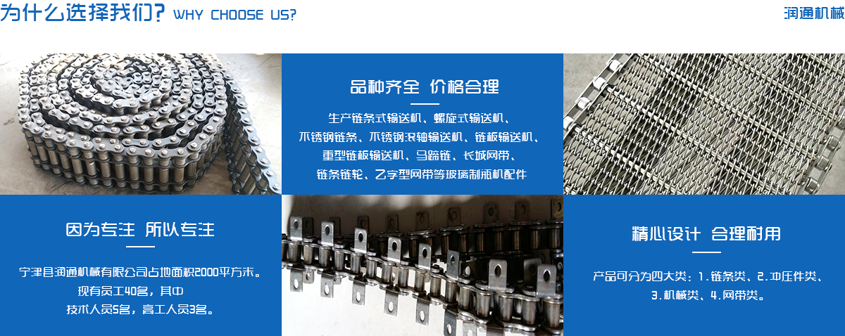 生產(chǎn)鏈條式輸送機(jī)、螺旋式輸送機(jī)、不銹鋼鏈條、不銹鋼滾軸輸送機(jī)、鏈板輸送機(jī)、重型鏈板輸送機(jī)、馬蹄鏈、長城網(wǎng)帶、鏈條鏈輪、乙字型網(wǎng)帶等玻璃制瓶機(jī)配件,食品機(jī)械配件及各種網(wǎng)帶的專業(yè)廠家 ,多年來產(chǎn)品暢銷各地玻璃廠和食品廠,在玻璃制品等行業(yè)中享有較高的聲譽(yù)。公司集摸具開發(fā)、機(jī)械設(shè)計(jì)生產(chǎn),銷售于一體的生產(chǎn)型企業(yè)。生產(chǎn)的自動(dòng)化流水線金屬傳動(dòng)網(wǎng)帶、鏈條等產(chǎn)品廣泛用于玻璃機(jī)械、食品機(jī)械、化纖機(jī)械、醫(yī)藥、電子、烘干機(jī)械、輪胎機(jī)械等行業(yè)。產(chǎn)品多銷往各個(gè)城市的機(jī)械廠、食品廠和一些涉及流水線或自動(dòng)化設(shè)備的公司。